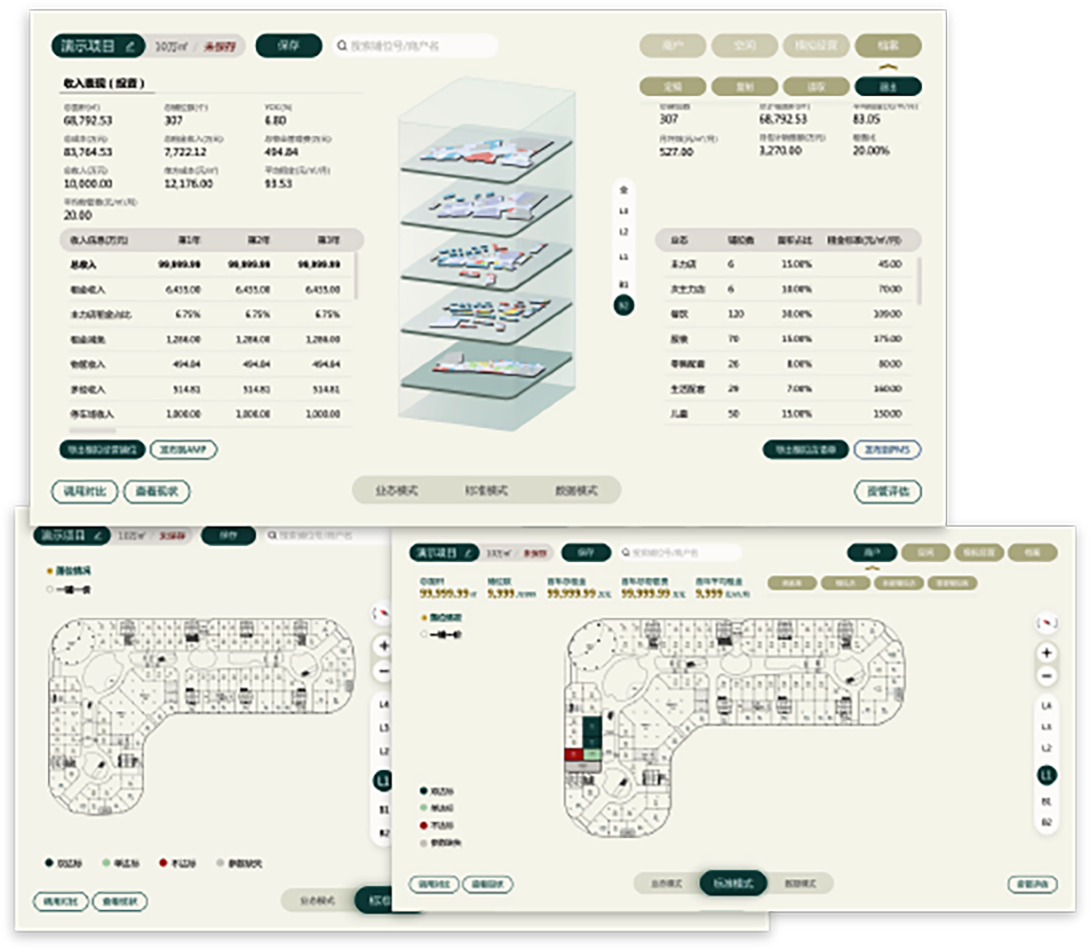 实时计算方案变化对项目整体、各业态、各楼层的收入、坪效影响,并可进行多版本方案对比